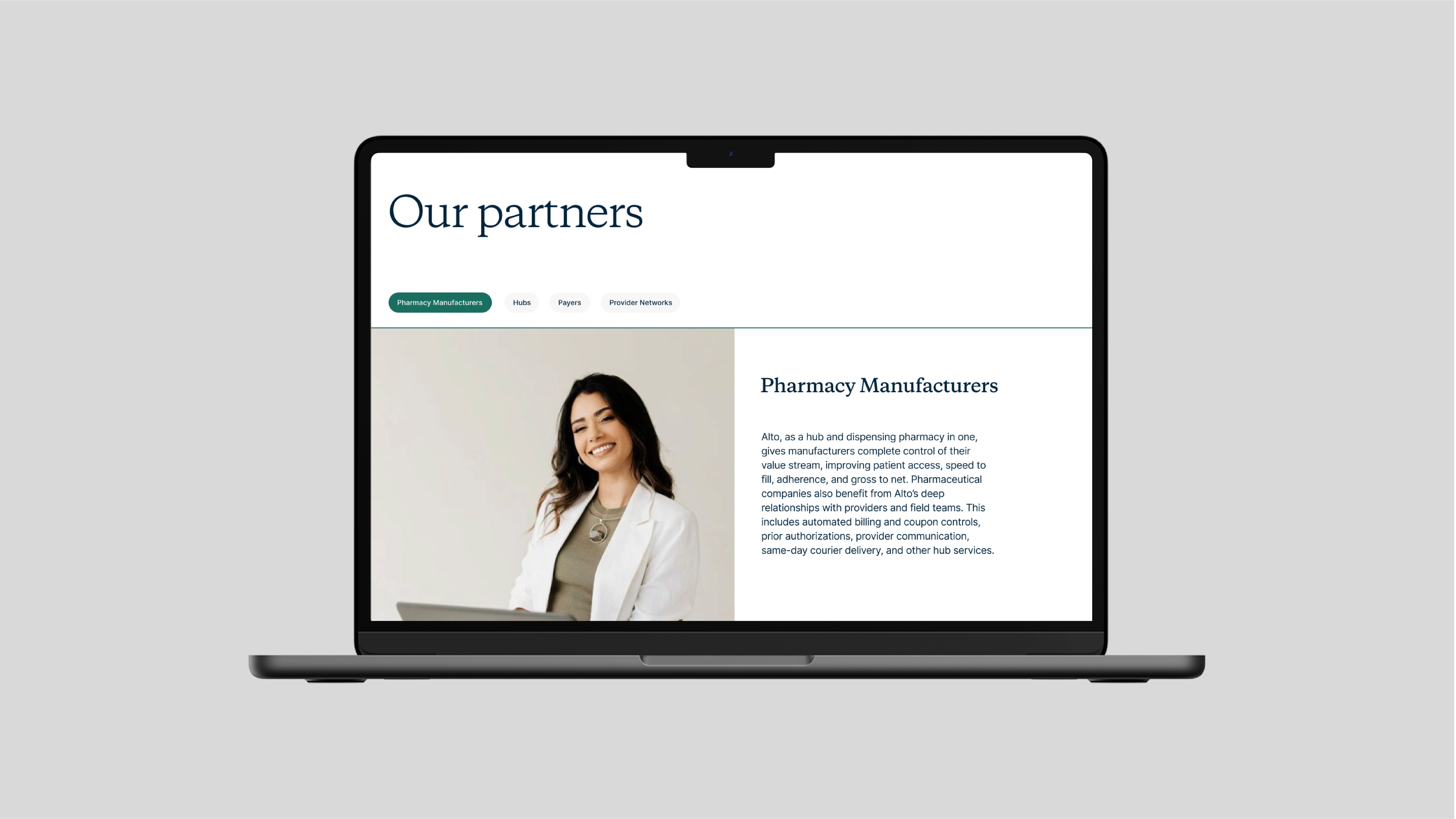 Alto Technologies needed a brand refresh that aided their journey in transforming pharmacy technology for a higher standard of care with the aim to position Alto as a configurable platform integrates hub with dispensing capabilities, automated and seamless single service provider solution that improves patient experience and reduces administrative burden.