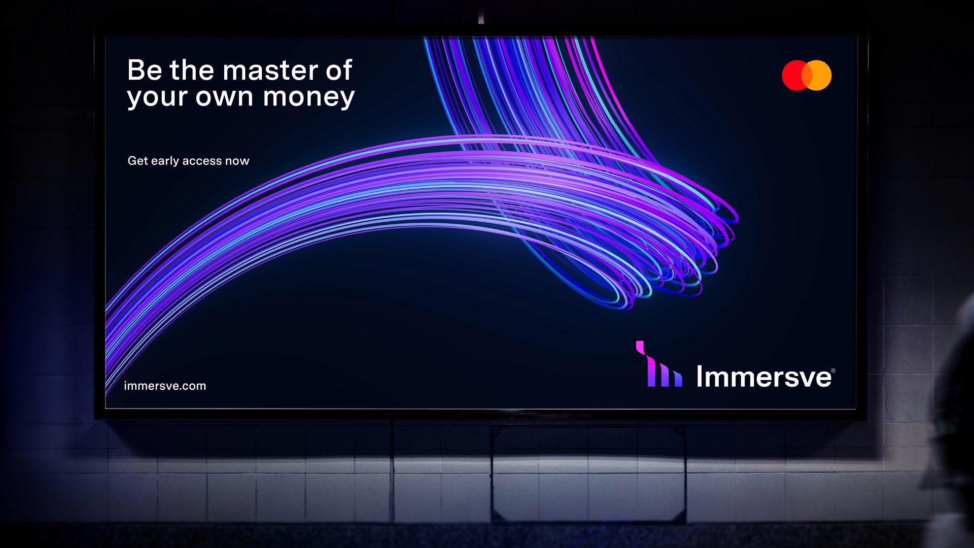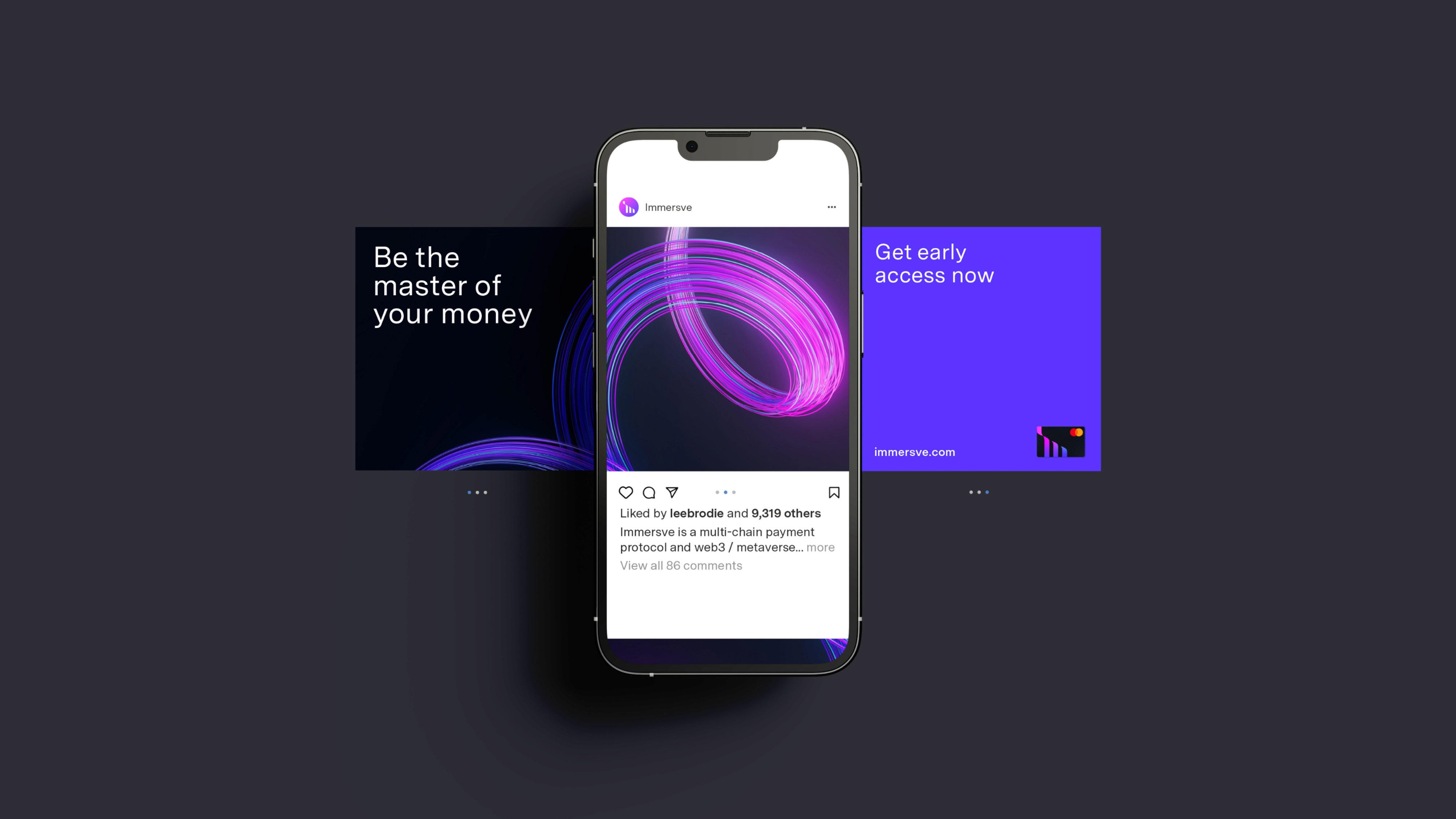 Immersve connects crypto directly from your web3 wallet for any purchase using a multi-chain payment protocol and web3 /metaverse Mastercard. The fluidity of the multi-chain technology enables transactions in a digital universe to happen near instantaneously. For this reason the brand refresh needed to emphasise the rippling pulse of data that captures the feeling of speed, connection and transaction all in one. These visuals in a addition to the core brand asset refinement created a tighter, consistent, and more premium brand that extended the visual metaphor to elevate the core brand proposition.